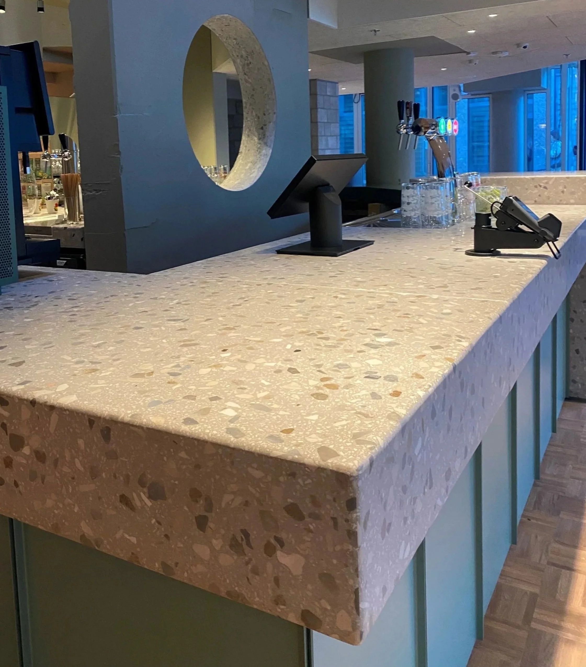 In 2023, Abbie Steinhauser and Bert de Munnik contacted us about using terrazzo as a bar cladding. The detailed drawings and model clearly demonstrated their envisioned application. Two colors were selected from the terrazzo of the dN3 series, complementing the overall color palette. The surface of the terrazzo was slightly sanded/roughened, making it easy to maintain and fitting the designers' aesthetic and visual wishes.